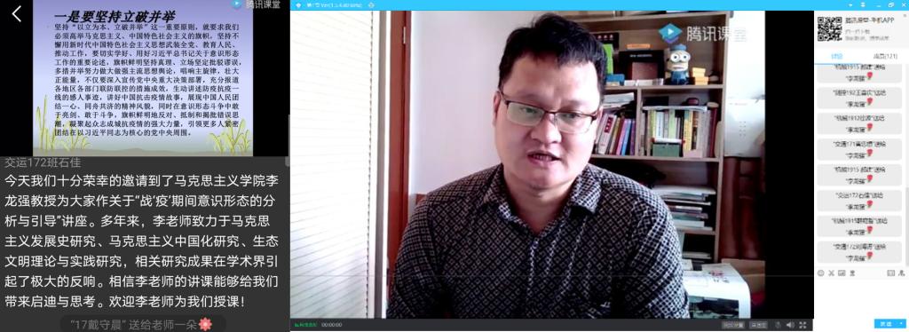 为了弘扬爱国主义精神,培育爱国主义情怀,做好爱国主义教育。3月27日上午10时,kai云体育官方app“初心理论”学习社举办主题讲座活动。邀请马克思主义公司李龙强博士通过“腾讯课堂”APP开展线上专题讲座,解读中国为什么能够迅速控制住武汉疫情,分析中国特色社会主义制度的显著优势,引导公司员工树立战胜疫情的信心与决心。公司共计226名同学参加此次线上专题讲座。