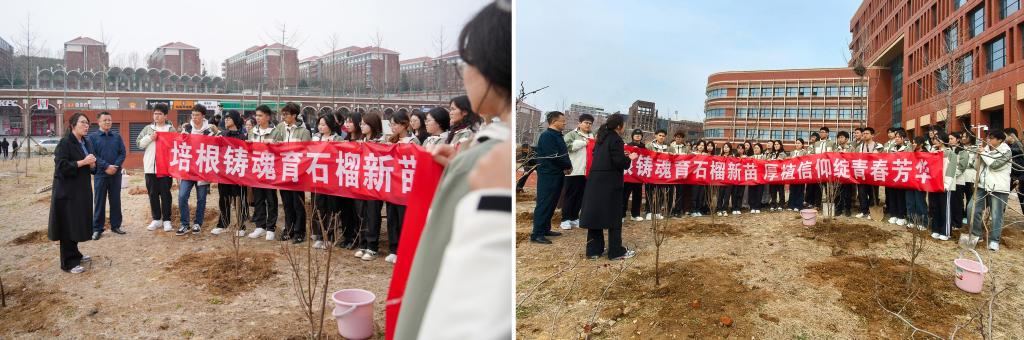 在图书馆西侧草地,老师们与各民族员工分组协作,挥锹铲土,共同栽下一棵棵石榴树,一起种下中华民族共同体意识的“树苗”。后勤管理处党总支书记王龙向在场员工说:“我们种植的这片石榴林,既是用劳动实践丈量知行合一的‘田间课堂’,更是将个人理想嫁接国家战略的‘成长苗圃’。新时代青年正如这满园石榴相拥成林,各民族员工如石榴籽般紧紧相拥,在共同浇灌的青春岁月里孕育出中华民族一家亲的参天大树!”