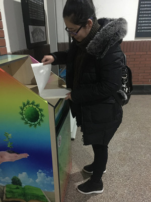 此次活动主要以回收废纸为主,生活部同学自己动手,制作了精致的废纸回收箱收集废纸,放置在教学楼入口处,得到了大家一致好评。同学们也主动将用过的废纸投到回收箱中,对于垃圾的回收利用起到了非常积极的作用。同时,员工会还在回收箱上放了未用过的新纸,在回收旧纸的同时,还可以自助拿一些新纸用,极大地方便了同学们的学习生活。
