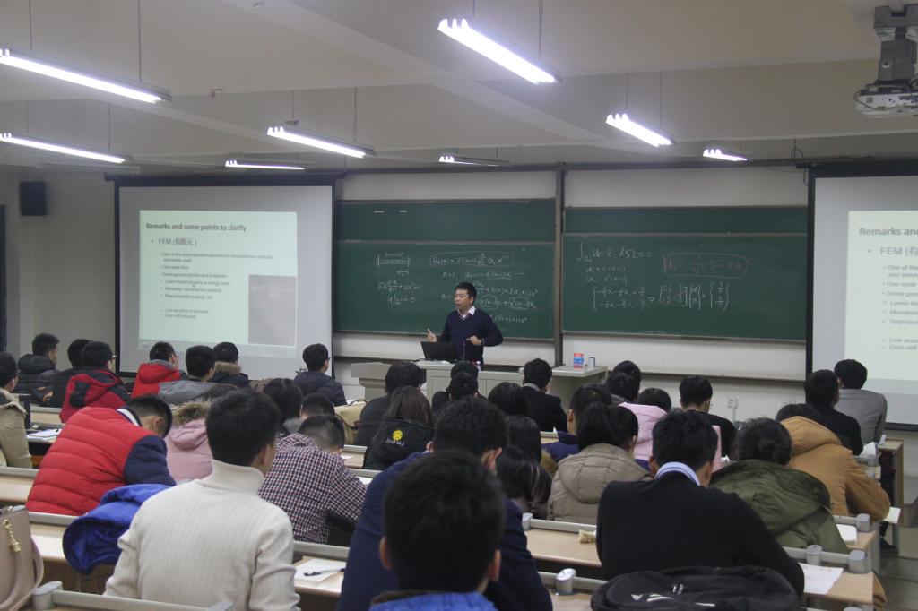 报告中,顾元通教授简要的介绍了个人在海外学习工作经历,并展示了他的团队在数值仿真方面做出的重要贡献,指出一个学术领域要想繁荣发展必须要有理论、实验和数值仿真的三足鼎立,缺一不可。上午的培训中,顾元通教授主要通过加权残值法推导出了五种常用的数值方法,并通过一个具体的例子让在座师生对数值方法的原理有了一个直接的认识,提出了“数值实验”的概念。下午的培训中,顾元通教授着重讲授了无网格法和分子动力学,介绍了无网格法的发展历史和基本原理,指出无网格法可以解决一些有限元法不能或很难解决的问题,是有限元法的一个有力补充;而分子动力学通过仿真计算更直接的反映了微结构的物理机理,通过跨尺度的数值运算能够更精确的反映事物本质。他表示数值计算行业需要新鲜血液,并鼓励同学们加入到数值计算的研究和应用中来。在整个培训过程中,顾教授热情地与师生进行互动交流,耐心地解答了师生的提问。