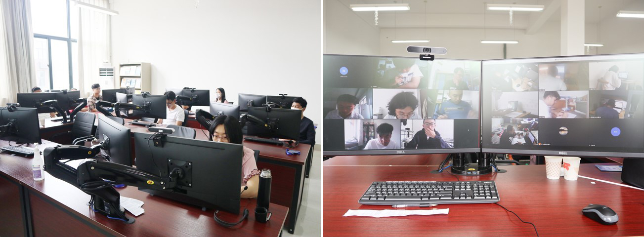 公司整合现有教学资源,将智能制造虚拟仿真实训室改造成在线考试中心,利用其双屏幕显示、虚拟化云桌面、视频交互等软、硬件资源优势,快速构建了“钉钉+腾讯会议”双平台视频监控场景,实现了对考生端双机位的视频交互、实时监考及全时录制。