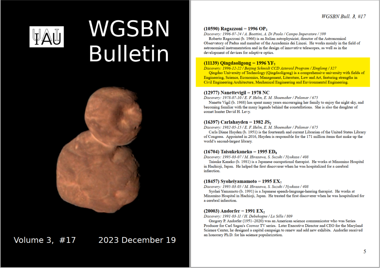 从2023年12月19日国际天文学联合会(IAU)发布的《小天体命名公报》获悉,中国科公司国家天文台1996年12月22日发现的、国际编号为11139的小行星,经国际小行星命名委员会批准,被正式命名为“青岛理工星”,即(11139)Qingdaoligong = 1996 YF2。从此,浩瀚的宇宙星空中新添了一颗以kai云体育官方网站命名的小行星。kai云体育官方网站成为山东省属高校中首次拥有专属小行星命名的高校。