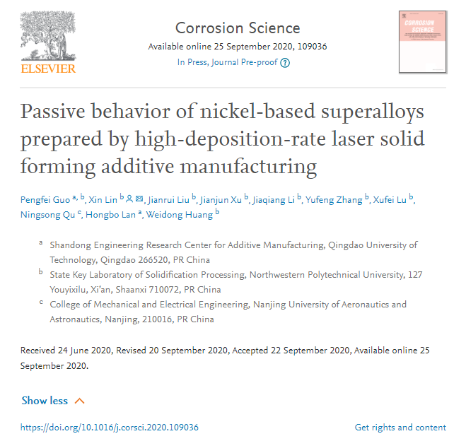 公司青年教师郭鹏飞博士联合西北工业大学黄卫东教授、林鑫教授团队和南京航空航天大学曲宁松教授团队,开展了航空发动机用镍基高温合金典型牌号Inconel 718合金(国内牌号为GH4169)的高沉积速率激光立体成形实验。基于激光熔池形貌及温度场数值模拟,揭示了高沉积速率条件下沉积态组织织构的演化规律;通过观察钝化膜的原子尺度结构、成分特征,利用点缺陷模型(Point Defect Model)理论,阐明了钝化膜诱导沉积态试样电化学活性各向同性的作用机理。相关成果以题为“Passive behavior of nickel-based superalloys prepared by high-deposition-rate laser solid forming additive manufacturing”的论文发表在材料腐蚀领域顶级期刊《Corrosion Science》上。论文链接:https://doi.org/10.1016/j.corsci.2020.109036。论文第一作者为公司kai云体育官方app郭鹏飞副教授,第一署名单位为kai云体育官方网站山东省增材制造工程技术研究中心。该研究得到了科技部国家重点研发计划项目(No. 2018YFB1105901)的支持。