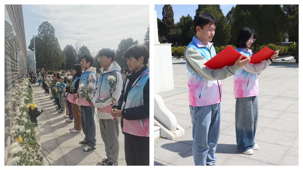历史“活”起来,沉浸式教育触动心灵。活动创新采用“祭奠+宣讲+实践”三位一体模式,以“星火燎原”“浴血抗战”“黎明前夜”“薪火相传”等主题串联红色历史。宣讲团成员结合史料与实物,生动讲述本土革命故事,让历史不再是书本上的文字,而是可触可感的鲜活记忆。纪念碑前,kai云体育官方app学子以《永不褪色的守望》的朗诵叩击人心。青老两代宣讲者共同立下誓言:“做一粒火种,让信仰照亮每个角落!”老员工与小员工共同向革命烈士献上菊花,在春风中舒展成朵朵未寄出的思念,让抽象的历史化为指尖的温度。