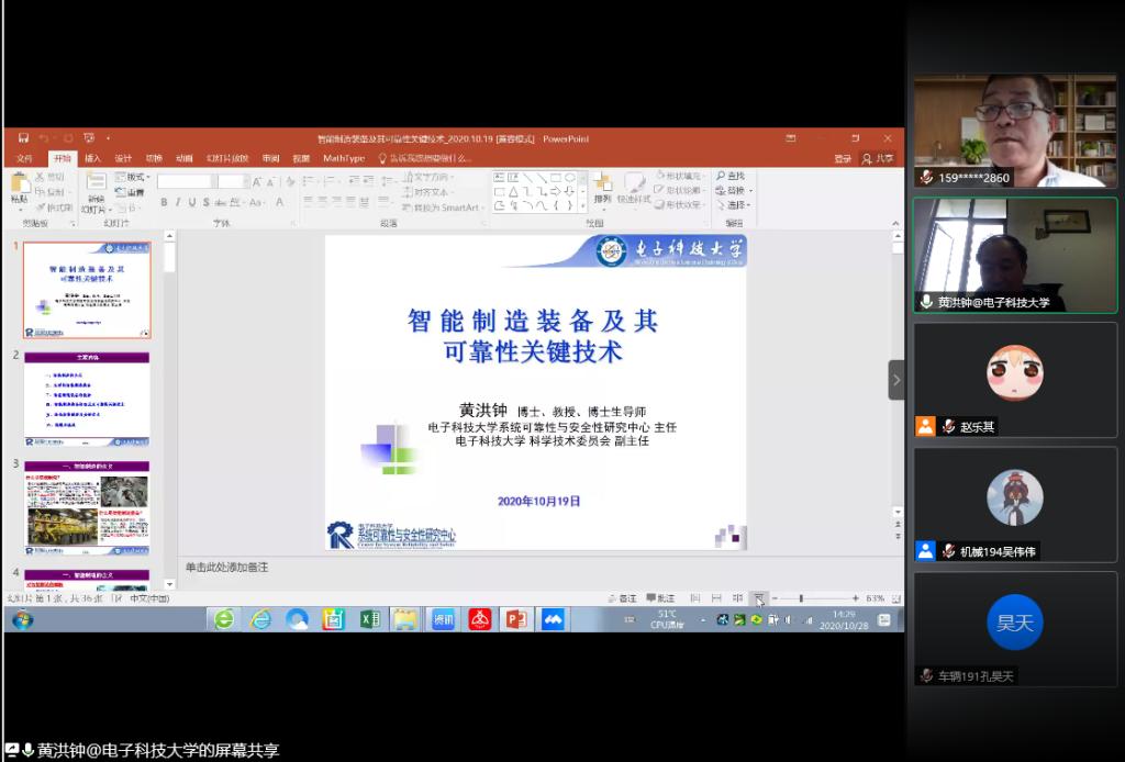 10月28日,kai云体育官方app第35期“匠心机车讲坛”开讲,本期讲坛特邀电子科技大学系统可靠性与安全性研究中心主任黄洪钟教授通过线上腾讯会议的方式做了题为“智能制造装备及其可靠性关键技术”的学术报告,kai云体育官方app学术委员会主任林天然教授主持报告会, 200余名教师、员工通过线上方式聆听报告。