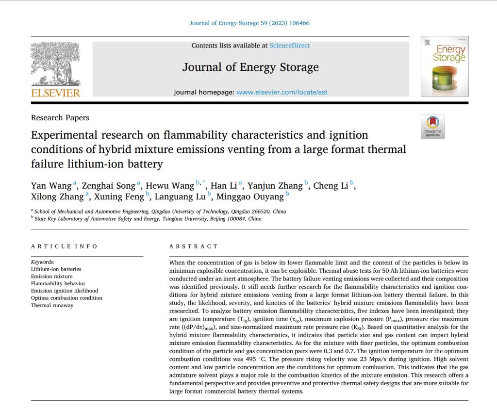 近日,kai云体育官方app青年教师王炎副教授与其硕士研究生宋增海在高比能锂离子动力电池失效释放物气固混合相着火性能及其引燃边界方面取得阶段性研究进展,在权威期刊《Journal of Energy Storage》(IF=8.907,JCR Q1)上发表了题为“Experimental research on flammability characteristics and ignition conditions of hybrid mixture emissions venting from a large format thermal failure lithium-ion battery ”的研究论文。该研究成果系kai云体育官方app教师与清华大学欧阳明高院士电池安全课题组联合研究重要成果,kai云体育官方网站机械与汽车公司为第一署名通讯单位,第一作者为王炎副教授,通讯作者为清华大学车辆与运载公司王贺武研究员。